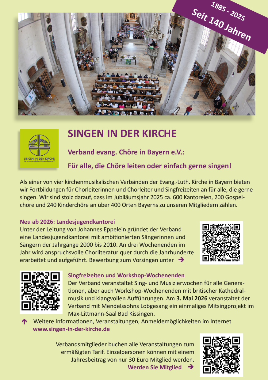 Ein großer Erfolg: Am 18. und 19. Oktober 2025 fand in Nürnberg und Augsburg das Vorsingen zur Gründung der „Bayerischen Landesjugendkantorei“ statt. 30 junge Menschen zwischen 15 und 24 Jahren aus ganz Bayern – von Lindau bis Wunsiedel – folgten der Einladung des Chorverbands SINGEN IN DER KIRCHE, sich um eine Aufnahme in den überregionalen Auswahlchor zu bewerben. Ausreichend viele junge Stimmen konnten aufgenommen werden, sodass einem Start der „Bayerischen Landesjugendkantorei“ nun nichts mehr im Weg steht!Landesjugendkantorei steht nach erstem Vorsingwochenende in den Startlöchern